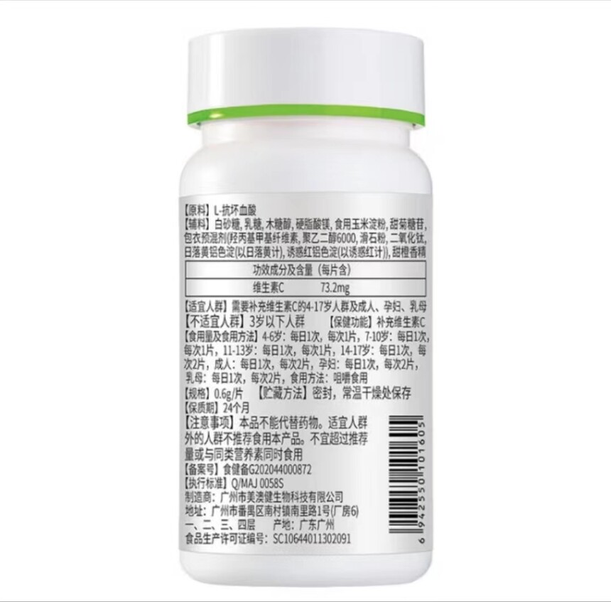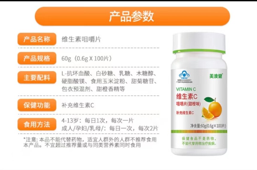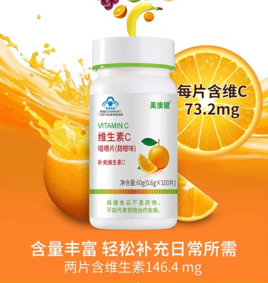 美澳健 维生素C咀嚼片(甜橙味) 60g(0.6g*100片) 广州市美澳健生物科技有限公司